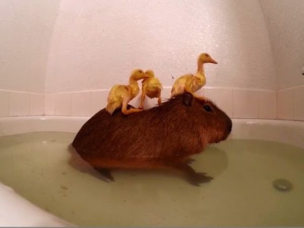 Смешной и веселый ролик, в котором капибара и трое утят принимают ванну…