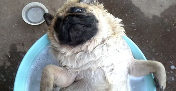 Видео с мопсом, принимающим пенную ванну в тазу, заставит вас задуматься об отдыхе....
