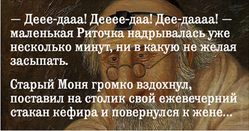 Моня закатил глаза и демонстративно вздохнул. Но отвечать жене не стал — Риточкино «деее-дааа!» обрело интонации свиста падающего фугаса. Он вошел в спальню, присел на край внучкиной тахты и нежно погладил Риточку по ручке.