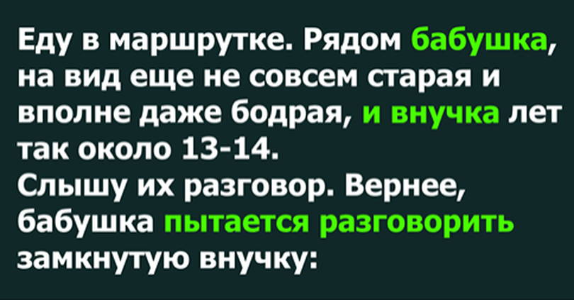 — Я размещу ее в инстаграме и подпишу «Мы с бабушкой едем в Мегу!»- рисует в своем воображении повеселевшая девочка и тут уж начинает рассказывать своей бабушке и о своих подружках и об учебе и обо всех своих нехитрых девичьих мыслях … Бабуле остается только слушать. Взломала-таки внучку, добилась своего! Сдается мне, молодое поколение недооценивает стариков: те оказываются куда лучшими психологами, чем можно предполагать.