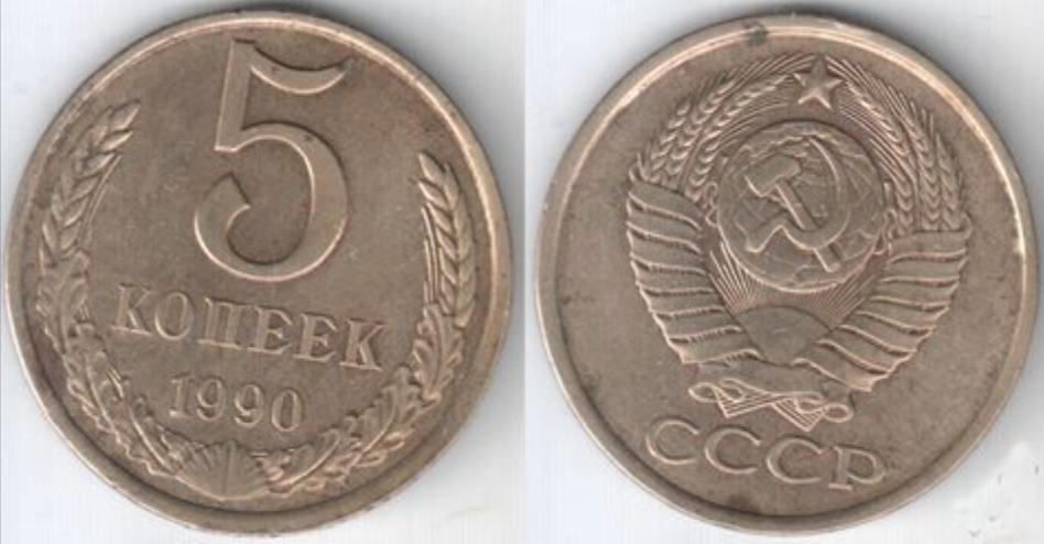 5 копеек 1990 г., цена — 80 $. (только для монет Московского монетного двора!)