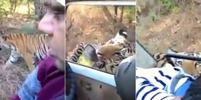 Эти тревожные кадры с тигром и туристами, сидящими в автомобиле без дверей, были сняты в индийском заповеднике Umred Karhandla Wildlife Sanctuary.