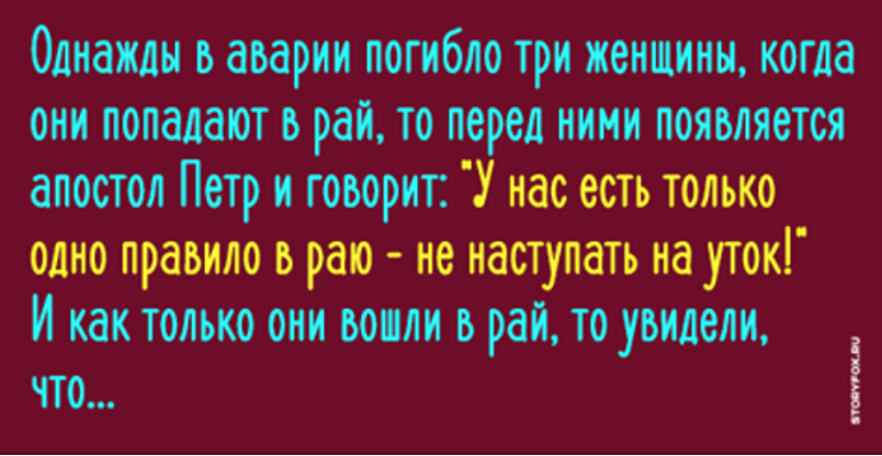 Однажды в аварии погибло три женщины, когда они попадают в рай, то перед ними появляется апостол Петр и говорит: «У нас есть только одно правило в раю — не наступать на уток!»