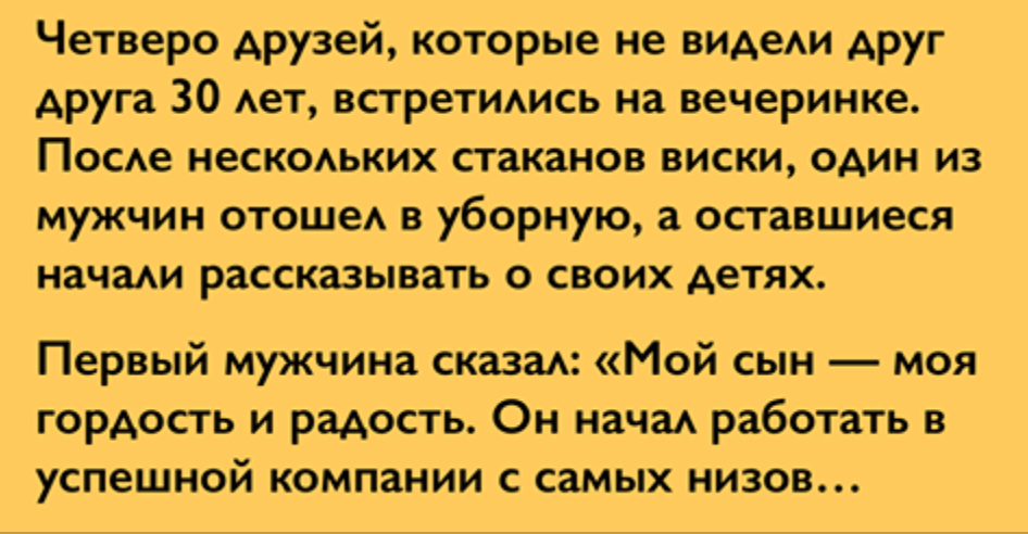 Четверо друзей, которые не видели друг друга 30 лет, встретились на вечеринке. После нескольких стаканов виски, один из мужчин отошел в уборную, а оставшиеся начали рассказывать о своих детях.