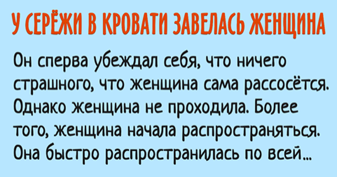 На его просьбу вывести жену отказом ответили в СЭС и ЖЭКе. В специальном журнале для холостяков Серёжа прочитал совет, что жену можно вытравить носками. Однако, сколько Серёжа не разбрасывал по квартире носки, жена не вытравливалась. Вытравились сами носки, вся грязная одежда, да и вообще вся грязь, к которой Серёжа так привык и без которой всегда быстро впадал в депрессию.