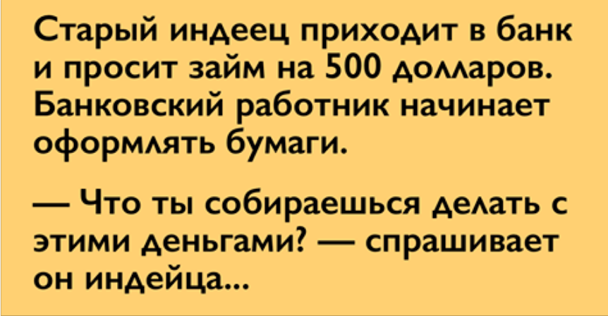 — Не знаю, у нее уже нет зубов, чтоб определить… В конце концов индейцу оформляют займ и выдают 500 долларов. Спустя несколько недель индеец снова приходит в банк, достает пачку денег и возвращает займ.