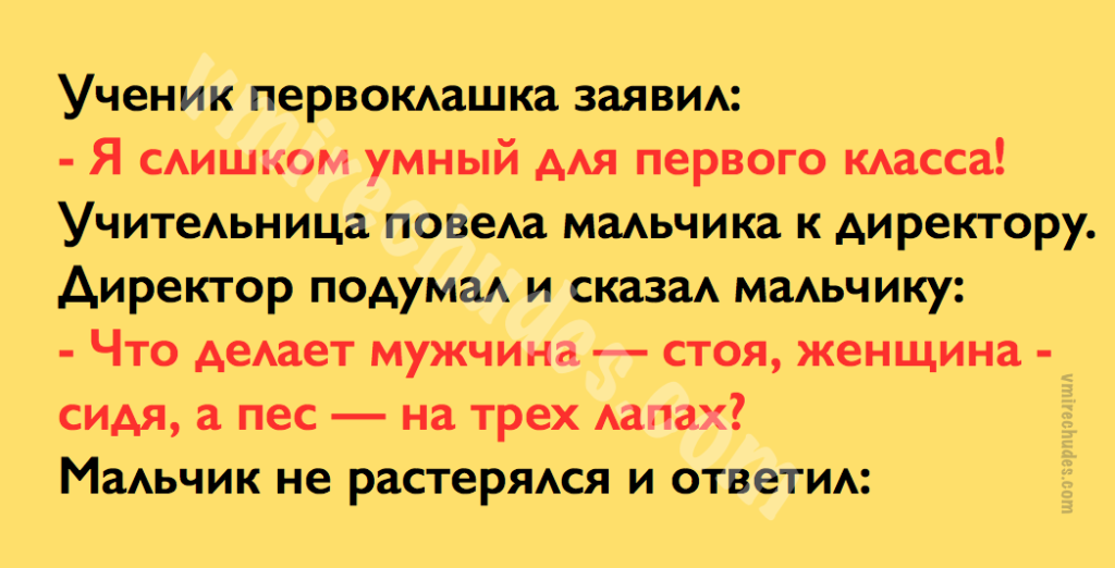 — Что делает мужчина — стоя, женщина — сидя, а пес — на трех лапах?