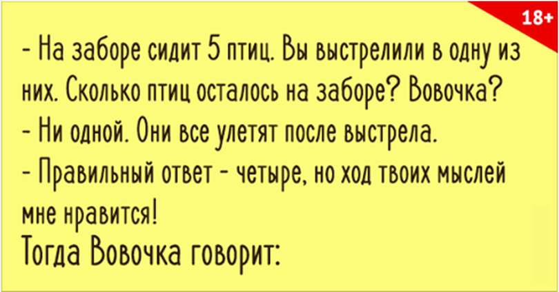 — На заборе сидит 5 птиц. Вы выстрелили в одну из них. Сколько птиц осталось на заборе? Вовочка?