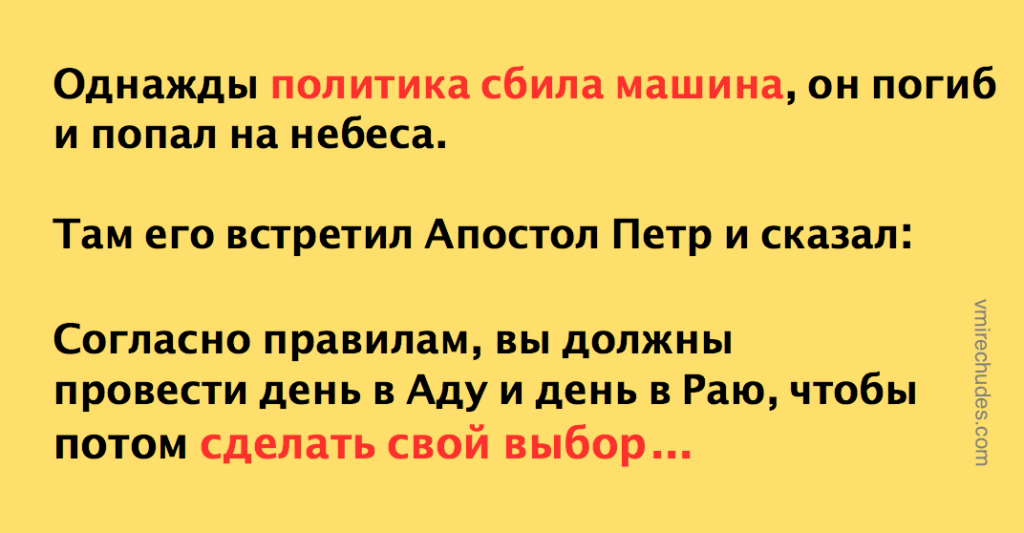 Он вошел в ворота преисподней и оказался на зеленой поляне для гольфа. Рядом стоял шикарный ночной клуб, из которого повыходили его бывшие коллеги и друзья. На них были надеты шикарные костюмы, они смеялись, жали политику руку и вспоминали прекрасные дни на Земле, когда все они вели беззаботную жизнь и хорошо зарабатывали на других. Шампанское, икра, лобстеры, танцы, красивые девушки… Да еще и дьявол оказался дружелюбным парнем! Но день подошел к концу, и политику пришлось снова вернуться к воротам Рая.