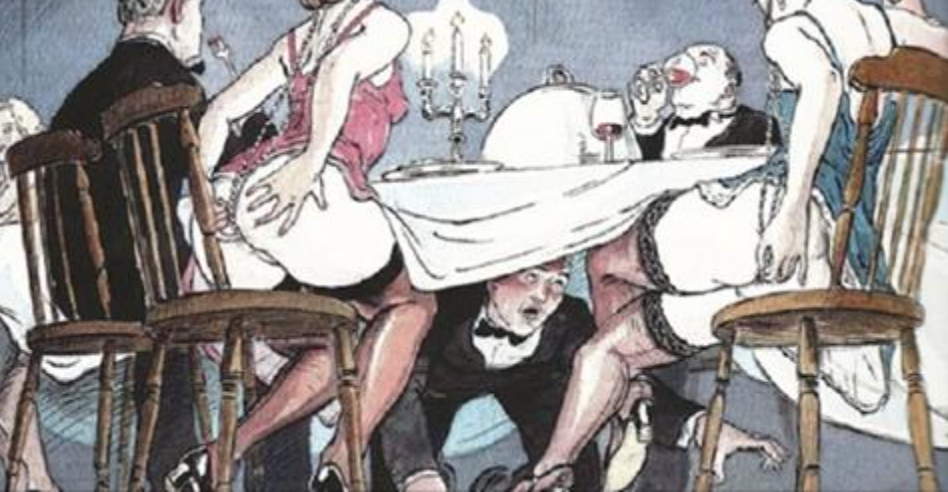 Особо озабоченные дамы могли себе позволить заказать прислугу, который во время девичников залезал под стол, чтобы сделать заказчицам приятное своим языком, во время того, как они сидели за столом со своими друзьями.