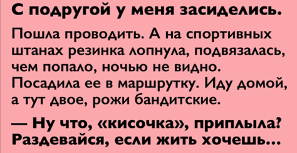 С ПОДРУГОЙ У МЕНЯ ЗАСИДЕЛИСЬ. Пошла проводить. А на спортивных штанах резинка лопнула, подвязалась, чем попало, проволокой, ночью не видно. Посадила ее в маршрутку. Иду домой, а тут двое, рожи бандитские.