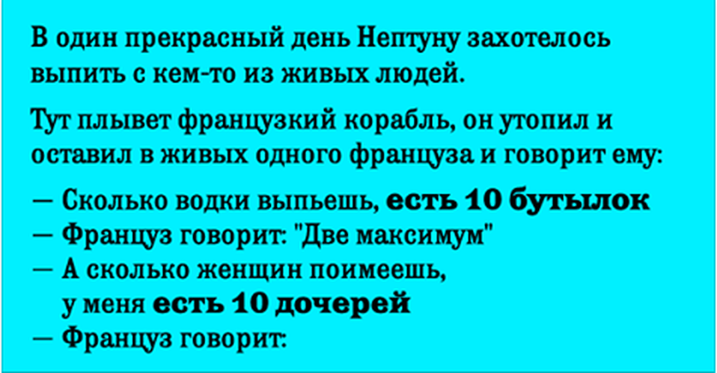 Тут плывет французкий корабль, он утопил и оставил в живых одного француза и говорит ему…