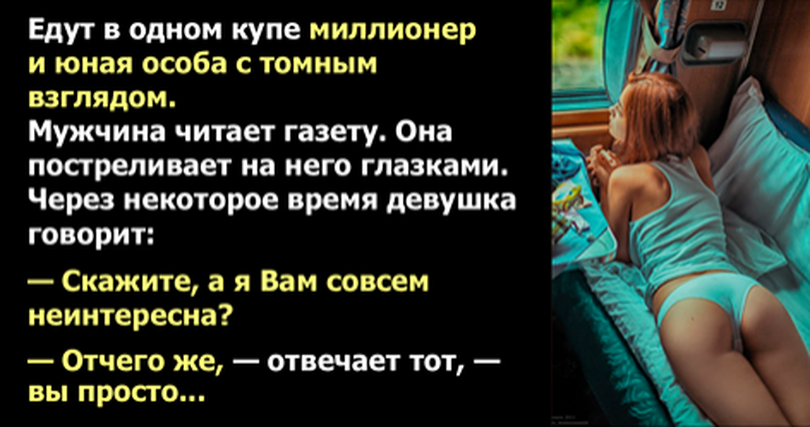 Едут в одном купе такой подтянутый, в годах, хорошо одетый мужчина и сногсшибательная юная особа, с томным взглядом.
