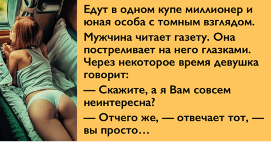 Едут в одном купе такой подтянутый, в годах, хорошо одетый мужчина и сногсшибательная юная особа, с томным взглядом.