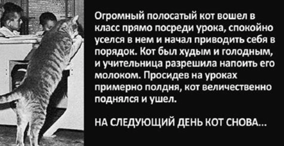 Огромный полосатый кот вошел в класс прямо посреди урока, спокойно уселся в нем и начал приводить себя в порядок. Кот был худым и голодным, и учительница разрешила напоить его молоком. Просидев на уроках примерно полдня, кот величественно поднялся и ушел. На следующий день кот снова пришел в школу, и снова — через день… Когда стало понятно, что он собирается приходить постоянно, ему дали имя Room 8, в честь кабинета, в который он вошел первым.