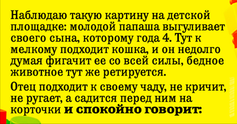 Отец подходит к своему чаду, не кричит, не ругает, а садится перед ним на корточки и спокойно говорит: