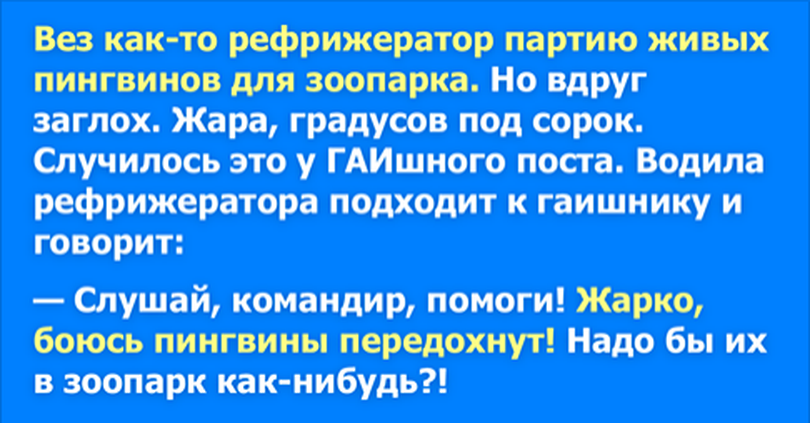 — Нет проблем! Берут пингвинов и уезжают. Проходит три часа. Мимо этого поста проезжает та самая машина с теми же бандюками. На заднем сидении сидят довольные пингвины с мороженым и шариками. Гаишник тормозит эту веселую компанию. Гаишник: