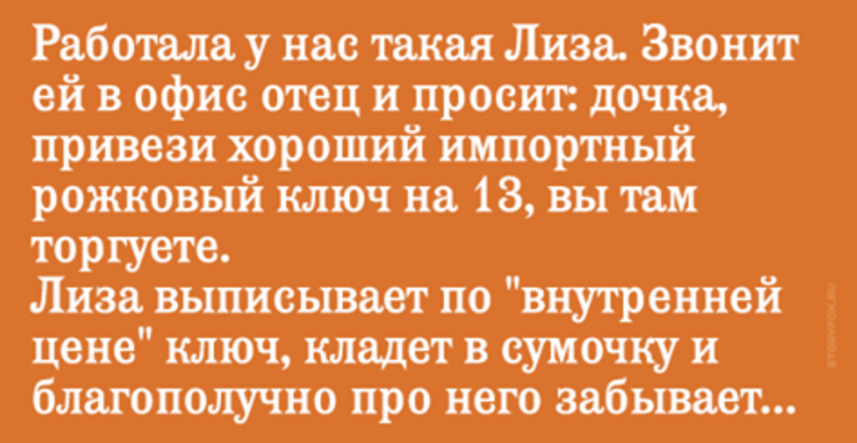Работала у нас такая Лиза. Звонит ей в офис отец и просит: дочка, привези хороший импортный рожковый ключ на 13, вы там торгуете.