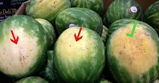Необходимо остерегаться огромных арбузов. К сожалению, наш климат не способствует выращиванию на полях плодов гигантских размеров. Следовательно, есть большая вероятность, что такие арбузы были искусственно подкормлены удобрениями. - По желтому пятну