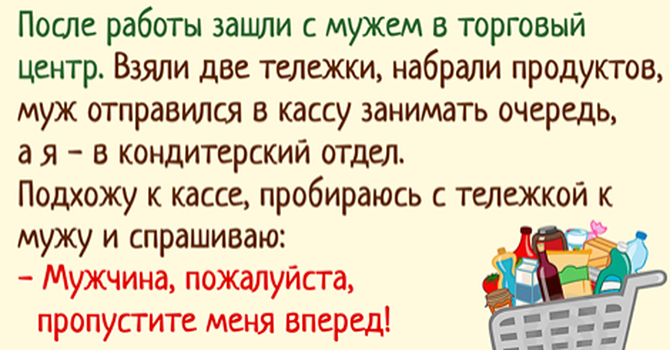 — Мужчина, а можно тогда я в вашу тележку переложу товар? — спрашиваю.