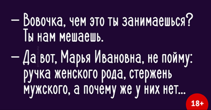 — Да вот, Марья Ивановна, не пойму: ручка женского рода, стержень мужского, а почему же у них детей нет?
