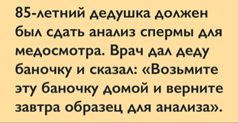 На следующий день 85-летний дедушка пришел в кабинет врача, и отдал ему баночку, которая была абсолютно пуста, как и вчера.