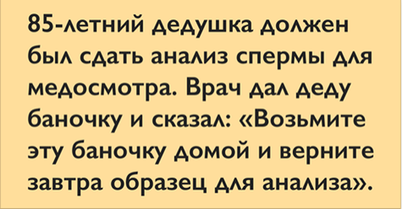 На следующий день 85-летний дедушка пришел в кабинет врача, и отдал ему баночку, которая была абсолютно пуста, как и вчера.