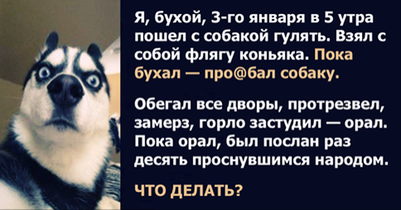 Прихожу — а этот х%р сидит в квартире перед дверью с глазами, как блюдца. Я, оказывается, поводок взял, коньяк взял, а его дома забыл.