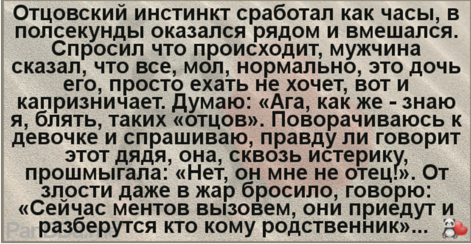Отцовский инстинкт сработал как часы, в полсекунды оказался рядом и вмешался. Спросил что происходит, мужчина сказал, что все, мол, нормально, это дочь его, просто ехать не хочет, вот и капризничает. Думаю: «Ага, как же — знаю я, таких «отцов».