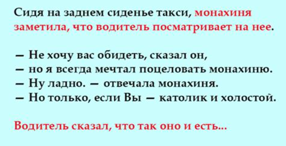 — Ну ладно. — отвечала монахиня. — Но только, если Вы — католик и холостой.