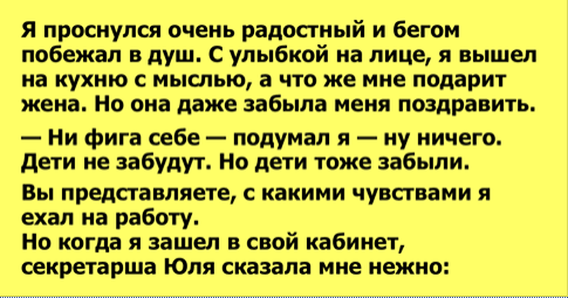 Вы представляете, с какими чувствами я ехал на работу. Но когда я зашел в свой кабинет, секретарша Юля сказала мне нежно: