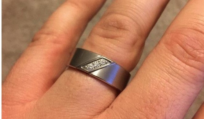 Для свадьбы Дэниэл выбрал вольфрамовые обручальные кольца с полосой из бриллиантов по диагонали.