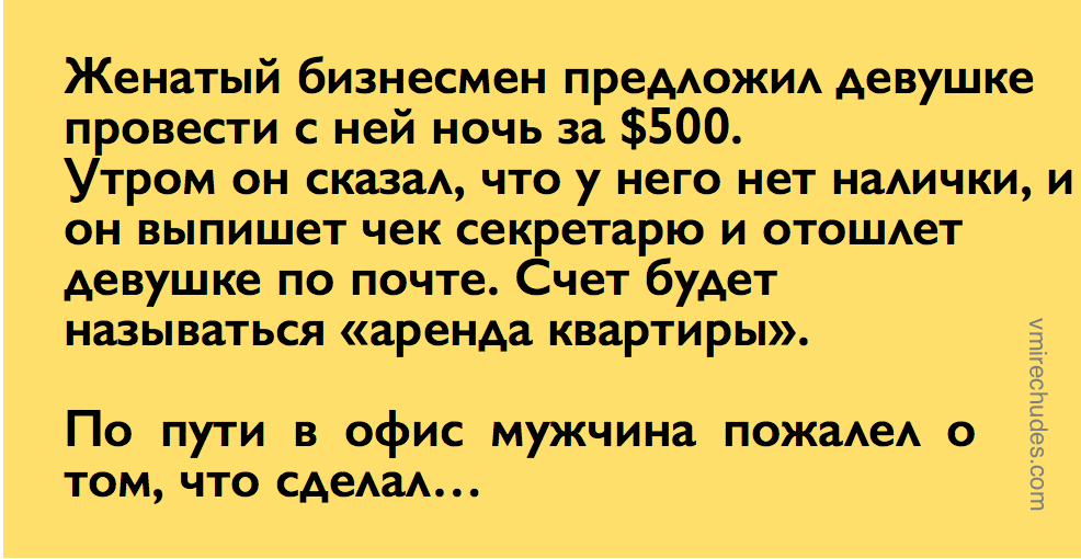 Утром он сказал, что у него нет налички, и он выпишет чек секретарю и отошлет девушке по почте. Счет будет называться «аренда квартиры».
