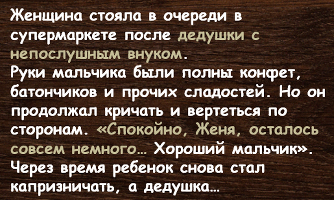 На кассе маленькому демону взбрело в голову выбросить все товары из тележки. Дедушка снова сказал спокойным тоном: «Жень, Жень, расслабься, приятель, не расстраивайся. Еще пять минут и мы будем дома. Успокойся, пожалуйста».