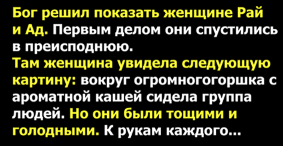Пусть эта притча станет для всех нас хорошим жизненным уроком!Поделитесь ею с друзьями, чтобы они тоже поняли, что Рай и Ад – это не место, это наш выбор!