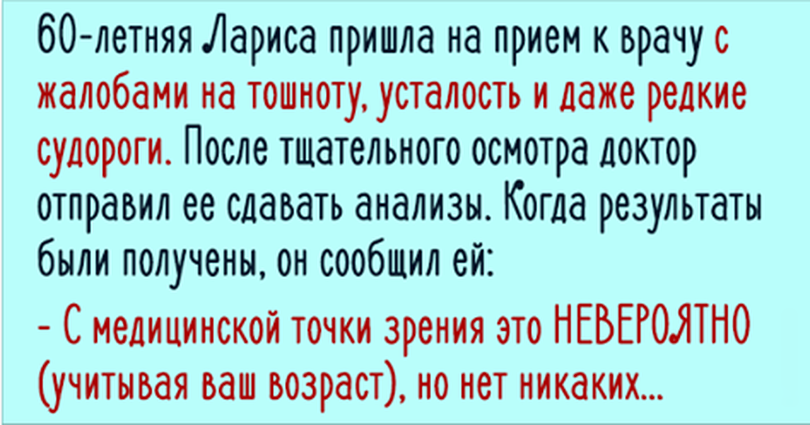 Невозможно не рассмеяться!48_result60-летняя Лариса пришла на прием к врачу с жалобами на тошноту, усталость и даже редкие судороги. После тщательного осмотра доктор отправил ее сдавать анализы. Когда результаты были получены, он сообщил ей: