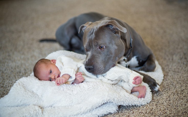 Когда мы впервые принесли дочку домой, оба пса сразу начали ее разнюхивать и лизать. Мне даже пришлось оттащить Зака, потому что он немного увлекся. Пес сразу же стал ярым защитником маленькой девочки. Когда она лежала на пледе, на полу, он обязательно держал одну лапу на нем.