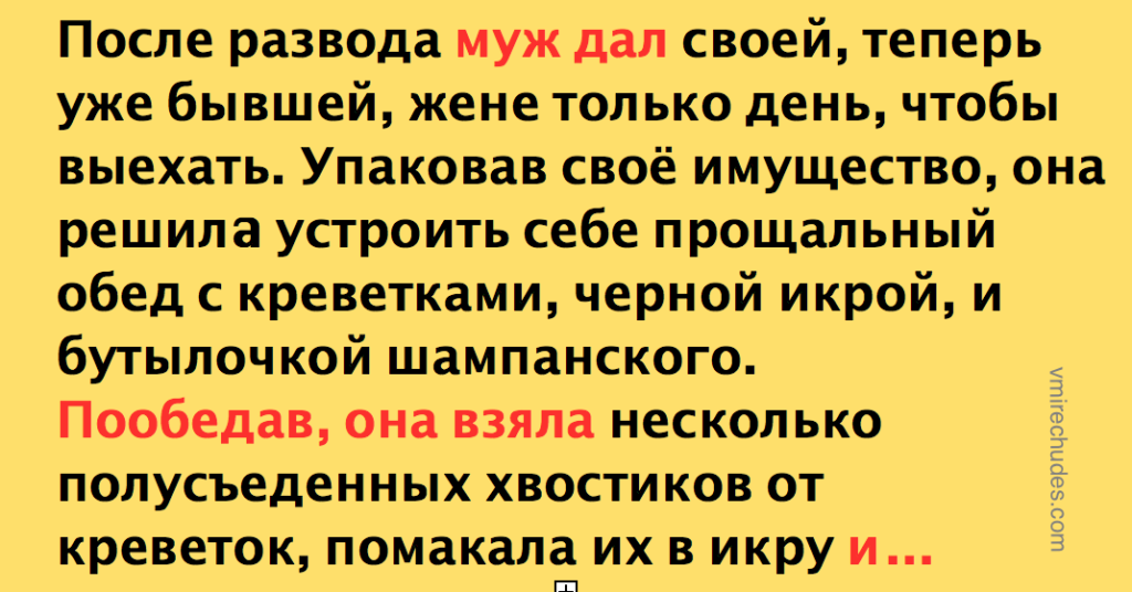 После развода муж дал своей, теперь уже бывшей, жене только день, чтобы выехать. Упаковав своё имущество, она решилa устроить себе прощальный обед с креветками, черной икрой, и бутылочкой шампанского.