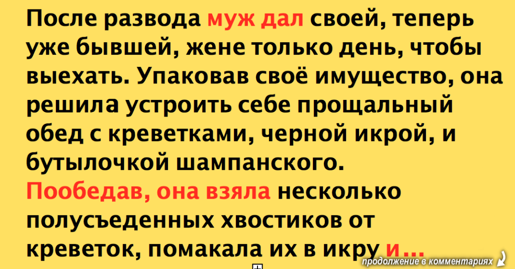 После развода муж дал своей, теперь уже бывшей, жене только день, чтобы выехать. Упаковав своё имущество, она решилa устроить себе прощальный обед с креветками, черной икрой, и бутылочкой шампанского.
